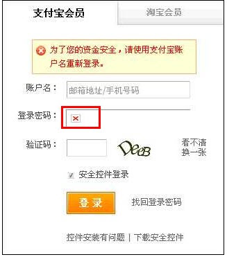 如果沒有安裝支付寶安全控件,密碼框會出現(xiàn)紅叉叉。