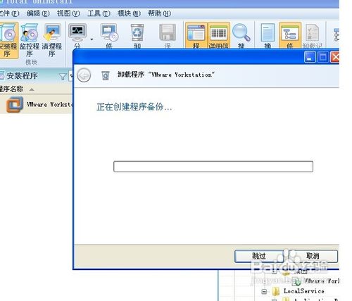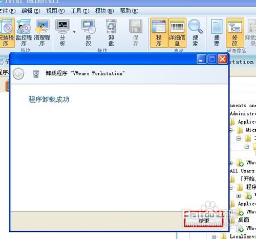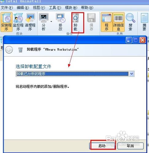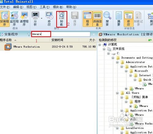1、打開Total Uninstall啟動(dòng)時(shí),在對(duì)話框中點(diǎn)擊“安裝程序”輸入vmware,剛找到它點(diǎn)擊“卸載” ,如圖