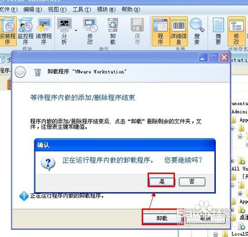 4、在卸載程序?qū)υ捒蛑?,提示單擊“是”,如圖