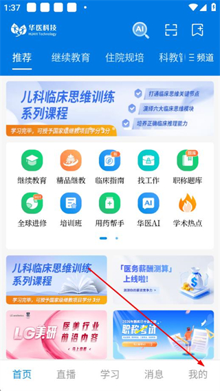 1、打開(kāi)“華醫(yī)科技”APP進(jìn)入首頁(yè),找到繼續(xù)教育功能入口點(diǎn)擊進(jìn)入,可瀏覽心血管內(nèi)科指南合集及CME課程等內(nèi)容,挑選適合的學(xué)習(xí)資料開(kāi)展專業(yè)知識(shí)提升。
