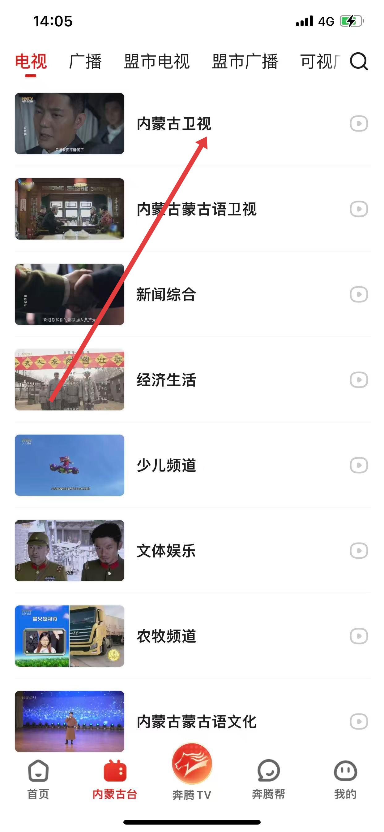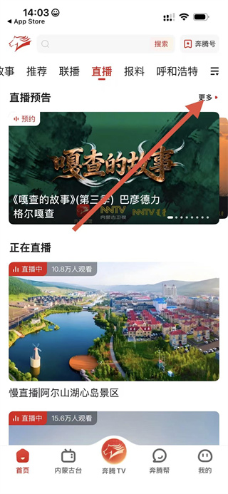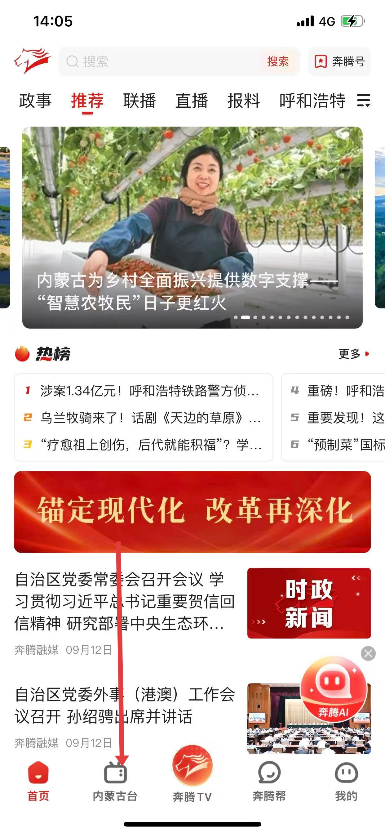 1、打開奔騰融媒App,點擊底部導(dǎo)航欄中的內(nèi)蒙古臺選項。