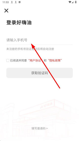 2、進(jìn)入登錄好嗨油頁面后,在手機(jī)號輸入框內(nèi)填寫號碼,勾選用戶協(xié)議后,獲取驗(yàn)證碼按鈕。