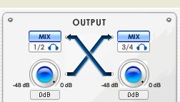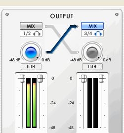 我們可以看到,在左邊INPUT輸入的面板中,左邊的那個其實就是對應著聲卡上的1/2輸入口,它有四個按鍵,可以選擇Line in線性輸入、話筒、幻相供電和數字口四個選項。比如我們在這個端口上插了話筒,那么就要選擇MIC,如果是電容話筒那么就要打開48V幻相供電。而右邊的3/4輸入口是可以插吉他、貝司等樂器的。如果要插吉他錄音,就要點亮GUITAR按鈕。而如果要使用數字輸入,則只要點亮DIGITAL按鈕,1/2輸入通道就會變成數字輸入了。輸出也是一樣,在右邊可以選擇將1/2或者3/4的輸出信號通過數字口輸出去。