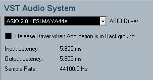 遺憾的是,這個1毫秒數值是只能用來過眼癮的,僅僅是理論數值,和實際用起來還是有差距的。當把緩沖設置為256的時候,Nuendo4中顯示延遲時間為5.8毫秒左右,如圖24所示。此時,再打開工程文件,一切正常,非常流暢和穩(wěn)定。而一般說來,5毫秒的延遲已經足夠用了。當然,如果要錄吉他的話也可以試試用最低延遲,因為僅僅是錄單軌,應該能撐得住。畢竟在這方面PCI-E接口是強項,因為它的傳輸速度是普通PCI接口的聲卡的16倍。所以在5毫秒時表現出的ASIO性能還是很出色的。