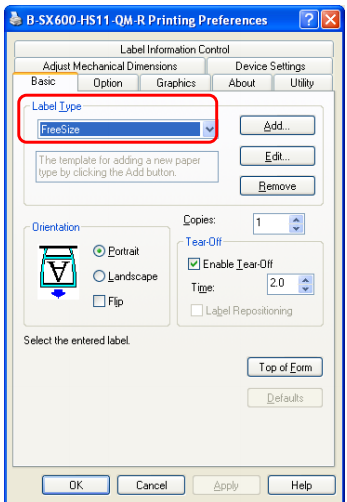 5. 點(diǎn)擊[Basic(基本)]標(biāo)簽,從[Label Type(紙張的型號(hào))]中選擇預(yù)先登錄了的 [用戶將使用的打印介質(zhì)] 。