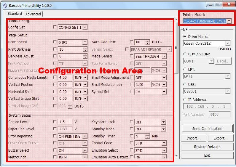 紅色的配置區(qū)域(Configuration Item Area)顯示了你所選擇的打印機(jī)型號(hào)/仿真語言所能配置的所有項(xiàng)目。每次選擇不同打印機(jī)型號(hào)/仿真語言時(shí),每一項(xiàng)都顯示其默認(rèn)值。
