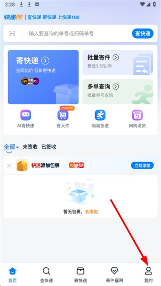 1、在快遞100首頁,點擊右下角我的,進入個人頁面。