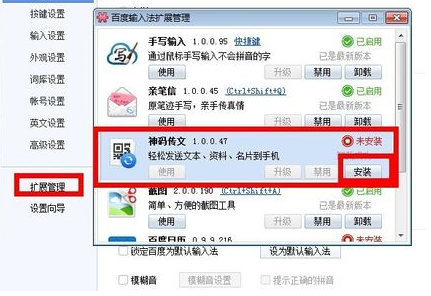 1、首先要求你的電腦上安裝有百度輸入法。打開百度輸入法設置,點擊左下角的“擴展管理”,點擊安裝,稍等幾秒很小的插件,他會灰??斓陌惭b完畢。安裝完成之后會在桌面生成一個快捷方式,方便下次使用打開。同時也會自動彈出“神碼傳文”。