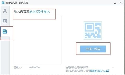 4、第三個功能是需要手動生成二維碼的,和第一個功能的區(qū)別就是這個適合內(nèi)容較多的,目前可以存儲300000文字,而第一個功能只有140文字哦,區(qū)別之大,由此可見。