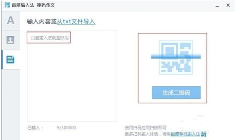 5、在左方輸入要生成的文字內(nèi)容,例如“百度輸入法就是好用”這段話,然后手動在右邊點擊生成二維碼,可以看到二維碼圖標在動,就是正在生成中。