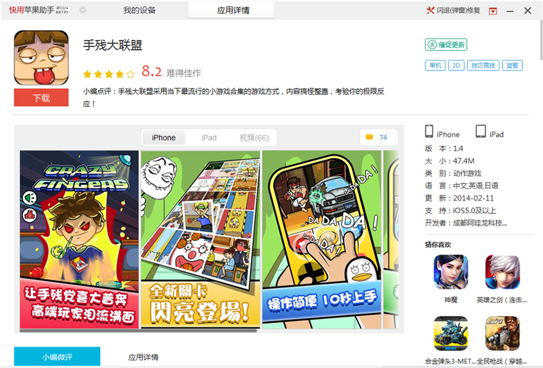 快用蘋果助手2014PC端2.3版本正式發(fā)布。與之前的版本相比,2.3版本在界面設(shè)計上更加簡單,去掉隱藏屬性,使界面一目了然,細節(jié)上的優(yōu)化,新增“7959玩游戲”欄目內(nèi)容精彩,獨家推出了“iPhone6特權(quán)專享區(qū)”,是不是很心動呢,那就快來體驗吧。