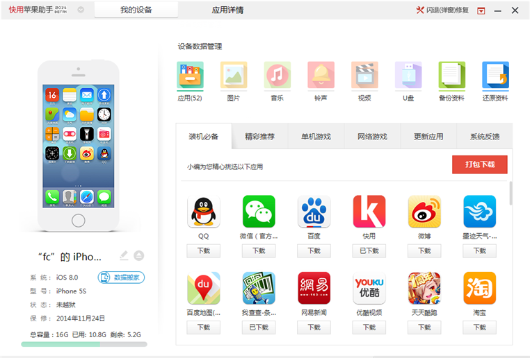 快用2.3界面欄目清晰,展示位豐富,內(nèi)容緊湊且一目了然。在快用PC端2.3新版,我們充分考慮了用戶查看熱門應(yīng)用/游戲的需求,在“特色新品”欄目特別新增了“熱門推薦欄”,讓用戶能在第一時間查看到我們推薦的新品熱門應(yīng)用/游戲。對于新機,我們?yōu)榱朔奖阌脩舸虬螺d,批量操作,小快在“裝機必備”欄目新增了“打包下載”的功能,現(xiàn)在你只需輕松一點,所有功能即刻盡收囊中。