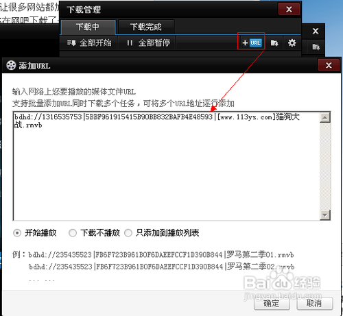 第二,將這個地址復(fù)制到百度影音下載管理→添加url中(注意鏈接最后有一個括號完,那個不要復(fù)制,它有時候是*,不同的文件會變化,只復(fù)制到擴展名就行),根據(jù)需要選擇只下載還是邊下邊播之類的即可。