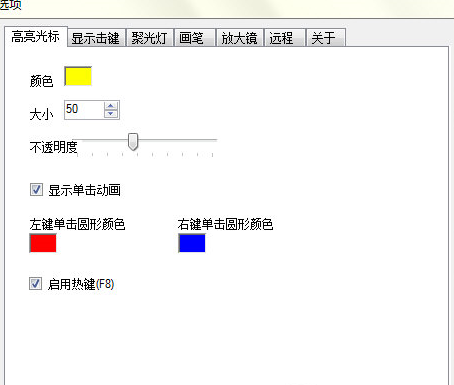 高亮鼠標指針:用彩色圓圈高亮顯示鼠標指針,當你單擊鼠標按鈕時圓形動畫可以顯示你鼠標單擊的行為。