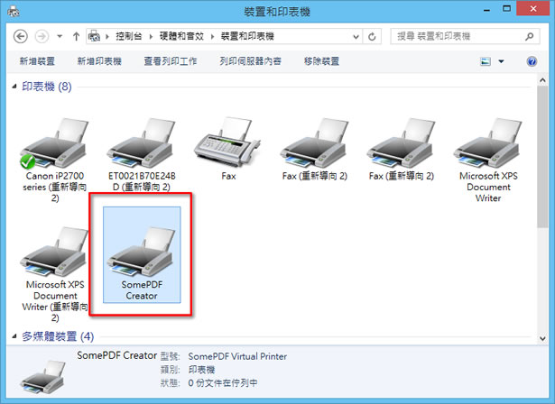 1.完成安裝,便可在印表機(jī)列表中找到 SomePDF Creator 這個(gè)虛擬印表機(jī)。