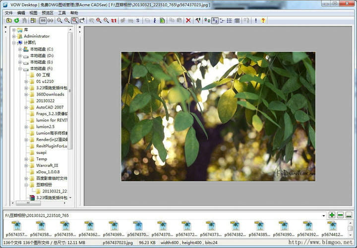 VOW Desktop主界面包含三個(gè)窗口,一個(gè)電腦資源瀏覽器,一個(gè)圖片預(yù)覽窗口,一個(gè)文件列表窗口;資源瀏覽器窗口用來快速定位到圖紙所在的文件夾,圖片顯示當(dāng)前選中的文件夾中VOW Desktop支持的全部文件,點(diǎn)擊文件夾下的某個(gè)文件,將在預(yù)覽窗口中顯示該文件,在打開較大的CAD文件時(shí),載入時(shí)間較長,不過與同類軟件相比,速度還是相當(dāng)優(yōu)秀的。