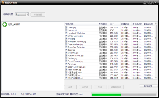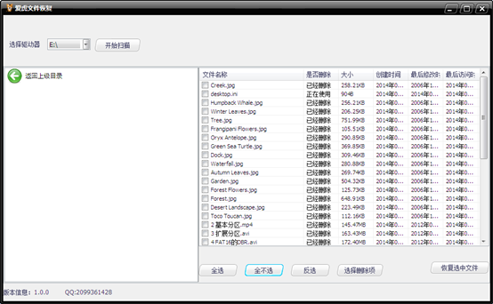 4 選擇您要恢復的文件,不用太在意”是否刪除”的文字,因為windows系統(tǒng)下就是這么記錄的,愛虎只是如實的顯示。我們?nèi)炕謴停赃x擇全選;然后,選擇恢復選中文件,如下:
