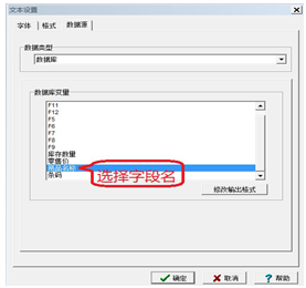 5、BYLabel菜單欄中選擇創(chuàng)建→文本,彈出文本設(shè)置對話框,數(shù)據(jù)類型中點(diǎn)擊下拉按鈕找到數(shù)據(jù)庫,選擇字段名(商品名稱),以此類推,創(chuàng)建條碼。(要打印內(nèi)容需要顯示出小數(shù)點(diǎn)后幾位,例如零售價(jià)中價(jià)格為70.00,需要修改輸出格式,顯示小數(shù))