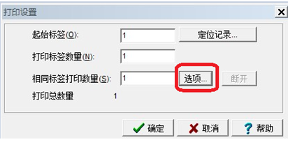 7、點(diǎn)擊打印按鈕,彈出打印設(shè)置對話框,填寫相應(yīng)的打印標(biāo)簽數(shù)量,確定即可打印。(如果需要設(shè)置相同標(biāo)簽的打印數(shù)量,點(diǎn)擊選項(xiàng)按鈕,選擇數(shù)量)