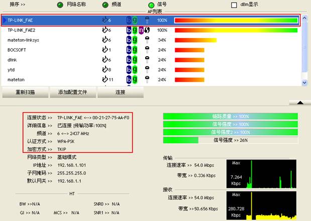 它的認(rèn)證方式是:WPA-PSK;加密方式是:TKIP;密鑰是:tp-link_fae。則TL-WN827N客戶端的認(rèn)證\加密要和接入點(diǎn)一樣設(shè)置,如下圖。