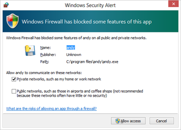 第一步:下載安裝Andy(測試系統(tǒng)為Windows 8),沒有什么困難的地方,注意通過Windows的防火墻即可。通過Windows防火墻