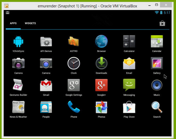第四步:現(xiàn)在你就應(yīng)該會看到一個標(biāo)準(zhǔn)的Android主屏幕界面了??梢杂檬髽?biāo)或是觸摸屏進行滑動切換操作,另外還有一個全屏按鍵,點擊后電腦就會變成一款A(yù)ndroid設(shè)備(可惜的是Windows 任務(wù)欄依然會顯示)。下面,不管是使用谷歌商店下載應(yīng)用、玩游戲,都可以實現(xiàn)了。