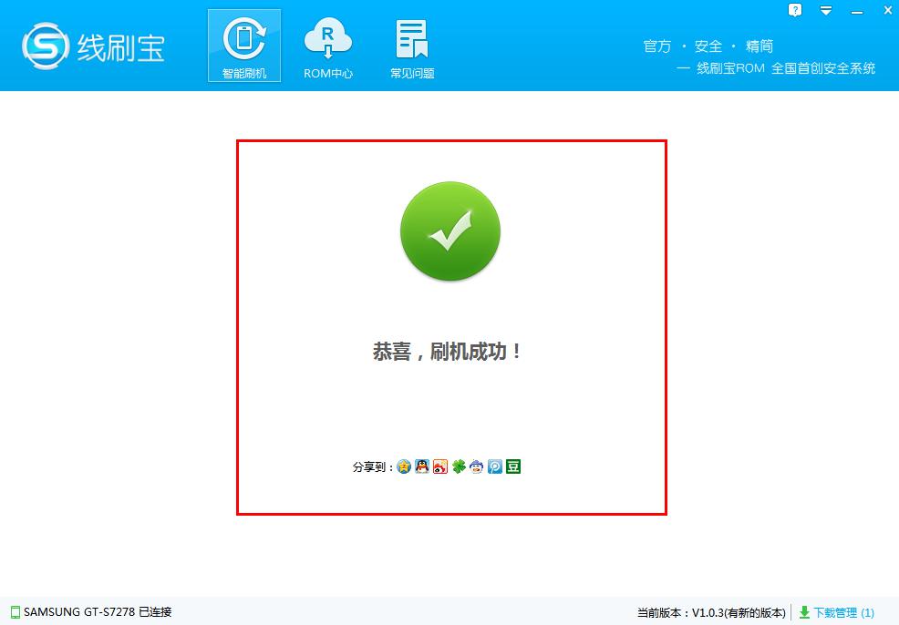 當線刷寶客戶端顯示刷機成功,并且您的手機重新啟動,則這次刷機成功完成。