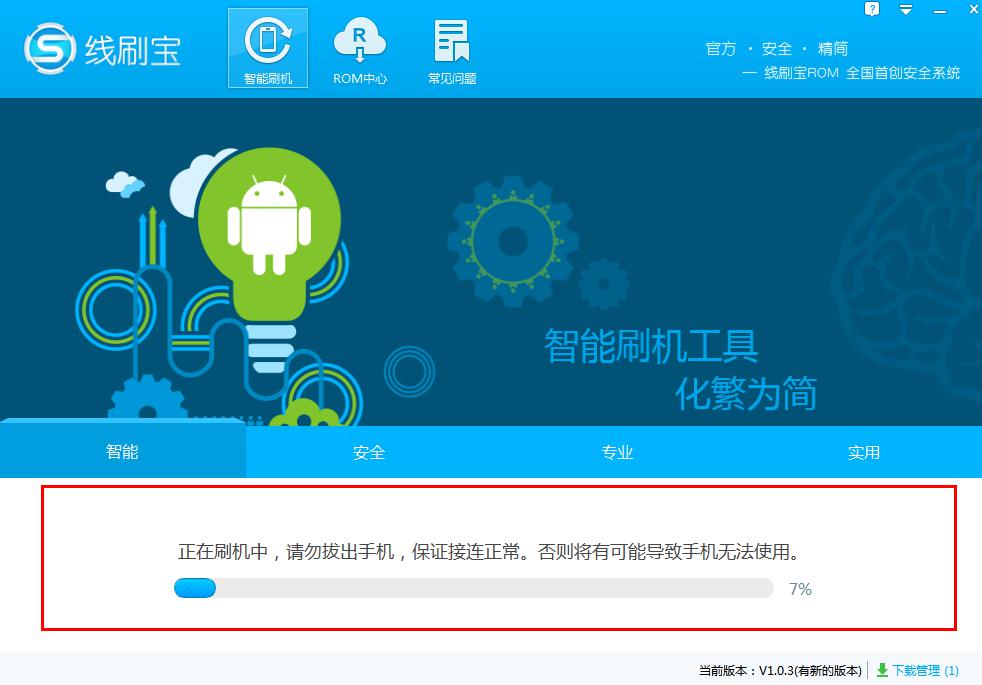 線刷寶線刷是一鍵智能刷機,刷機過程中不需要進行任何操作。如果刷機過程中,數(shù)據(jù)線中斷,需要重新插入數(shù)據(jù)線重新刷機。(排除不能自動進入刷機模式。)