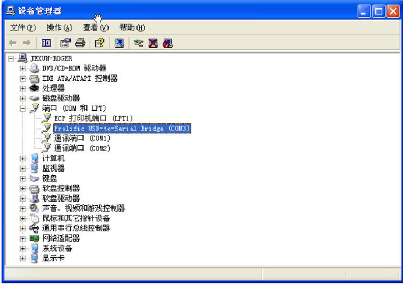 2.計(jì)算機(jī)重新啟動后插入usb數(shù)據(jù)線,在控制面板的“系統(tǒng)”屬性中的設(shè)備管理器的“端口”中可以看到USB轉(zhuǎn)COM 的端口號。(如下圖例的COM3)