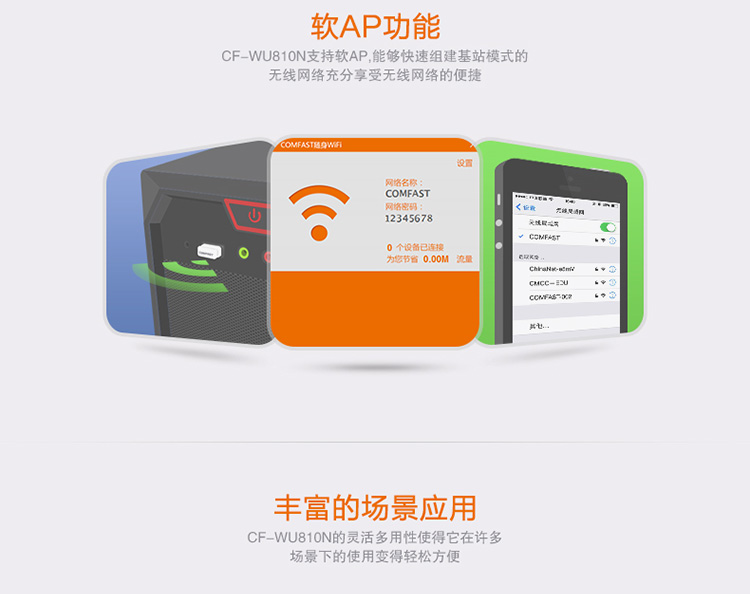 COMFAST CF-WU810N超迷你USB網(wǎng)卡驅動程序,是官方驅動程序,是使用這款無線網(wǎng)卡的必裝驅動。COMFAST CF-WU810N十分的小巧,是最時尚的無線網(wǎng)絡設備,不占空間的超迷你設計,插在計算機上讓人幾乎忘了它的存在。采用最新802.11n技術及Green WLAN技術,不僅提升無線速度達150Mbps,更可依無線訊號質量自動調整傳輸功率,節(jié)能又環(huán)保。支持WMM影音優(yōu)先功能,能讓多媒體影音傳輸超順暢;不僅如此,隱形網(wǎng)卡可作為無線發(fā)射器,連接至有網(wǎng)絡的電腦,即可分享無線網(wǎng)路信號給其它WIFI上網(wǎng)設備