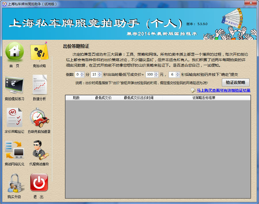 策略驗證--輸入一種出價策略(如最后15秒出最高價),自動根據(jù)真實(shí)歷史庫匹配該策略能否在近2年的歷屆拍牌中成功中標(biāo)。結(jié)合模擬練習(xí),找到最適合自己的出價策略。