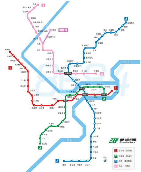 目前運營線路有5條,包括1號線、2號線、3號線、6號線及國博線,運營里程達到202公里,車站116座。由于重慶主城區(qū)地理條件復(fù)雜,已建成的線路采用以下兩種制式:跨座式單軌,應(yīng)用線路有2號線、3號線;鋼輪鋼軌鐵路,應(yīng)用線路有1號線、6號線及其支線國博線。兩種制式在建設(shè)成本、適宜環(huán)境、噪音控制、速度運力等方面各有不同。