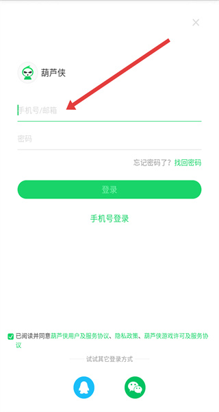 4、在輸入完成登錄信息后,點擊登錄按鈕,完成葫蘆俠APP的登錄流程。