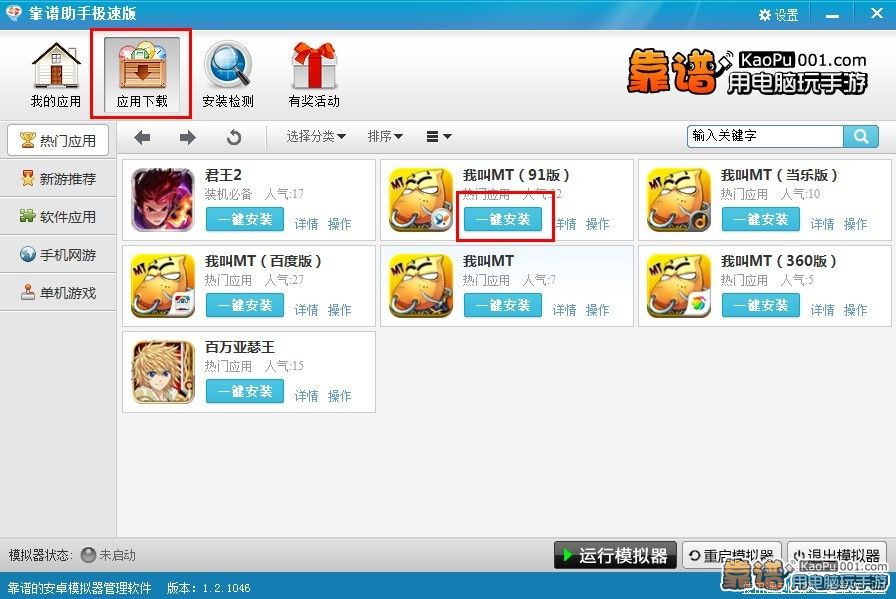 點擊應用下載,然后選擇你要下載的游戲,點擊“一鍵安裝”即可裝到我的應用里,由于MT游戲較大,安裝的時候時間會比較久,一會會詳細說到。