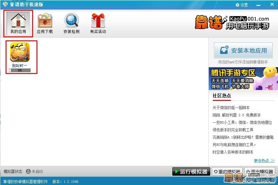安裝到我的應用之后,靠譜模擬器就會啟動,這時還未完全安裝好游戲,需要再次點擊我叫mt游戲圖標,讓游戲安裝到模擬器內。即可成功啟動游戲。