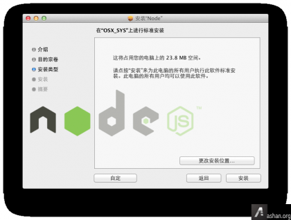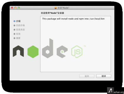 第一步,從nodejs.org 中下載Node.js for Mac 安裝包,也就是一個6M多的pkg文件,下載之后點擊安裝即可。