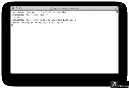 然后在終端里面敲入命令 node he.js 這里都he.js是你javascript文件都路徑回車就OK了!終端會顯示如圖: