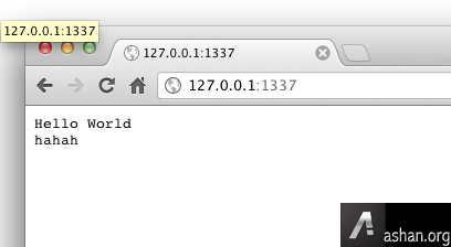 var http = require(http); http.createServer(function (req, res) { res.writeHead(200, {Content-Type: text/plain}); res.end(Hello World hahah); }).listen(1337, "127.0.0.1"); console.log(Server running at http://127.0.0.1:1337/);