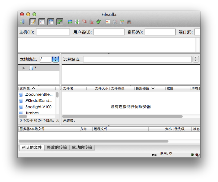 首先,自然是要下載 Filezilla for mac中文,下載安裝之后,首次打開將會使下圖所示的界面。