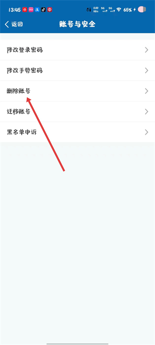 3、進入賬號與安全頁面之后,點擊刪除賬號選項。