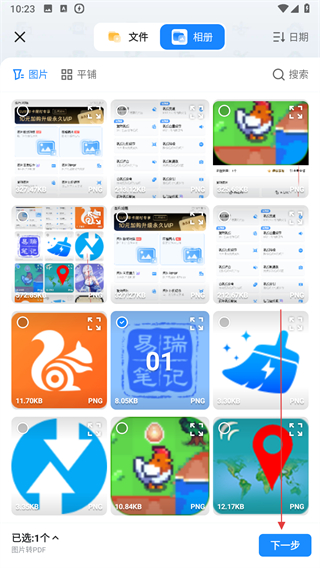 3、在相冊(cè)里選中要轉(zhuǎn)換的圖片,點(diǎn)擊界面右下角的下一步,進(jìn)入轉(zhuǎn)換設(shè)置界面。