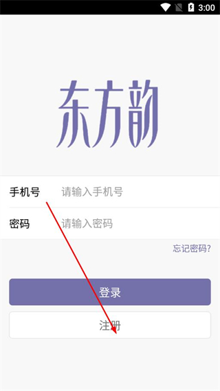 1、打開東方韻app的登錄頁面,在頁面下方找到注冊。