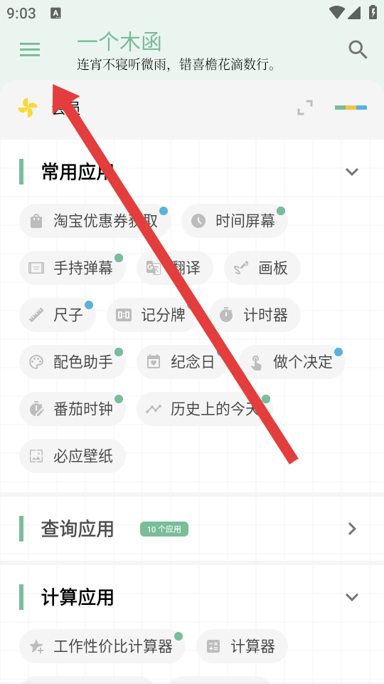 1、打開一個(gè)木函APP,需要點(diǎn)擊左上角的三條橫線菜單按鈕,展開側(cè)邊欄。