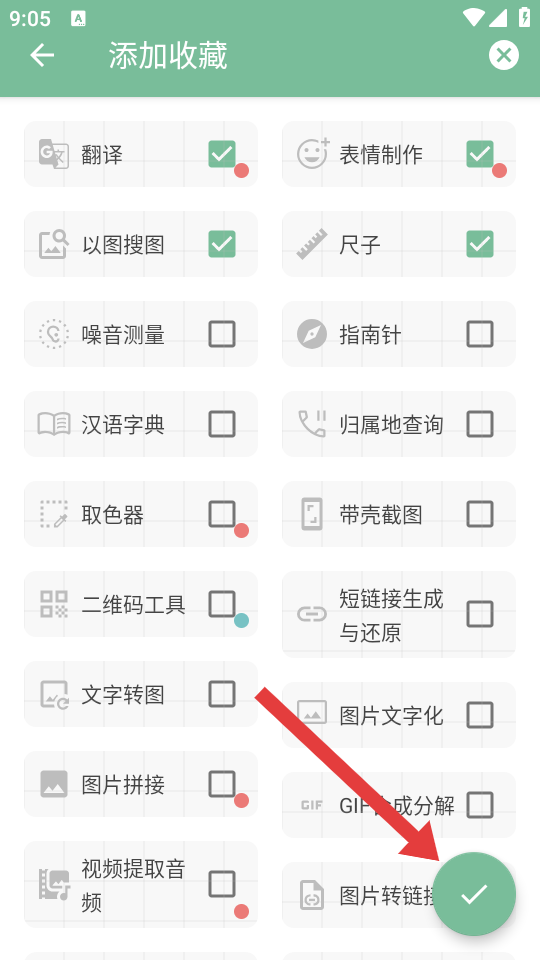 4、在添加收藏界面,勾選想要添加的小組件,然后點(diǎn)擊右下角的對(duì)勾按鈕,完成小組件的添加操作。