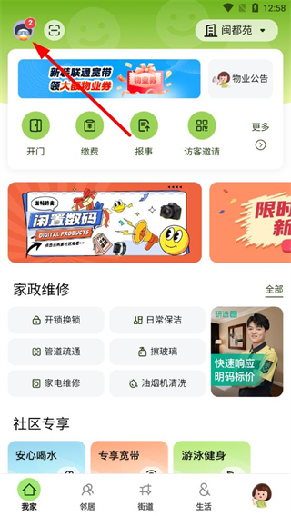 1、在住這兒app的我家頁面左上角,點(diǎn)擊頭像圖標(biāo),展開側(cè)邊功能菜單列表。