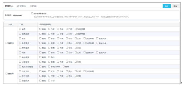 點(diǎn)擊新增角色,設(shè)置好角色名稱,如銷售經(jīng)理、倉(cāng)管員等,保存后進(jìn)入角色權(quán)限設(shè)置頁(yè)面。