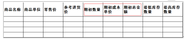 商品模版中有期初庫(kù)存字段,請(qǐng)注意錄入有庫(kù)存的商品數(shù)量,如有遺漏,開賬后,無(wú)法補(bǔ)錄。如下圖: