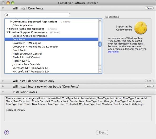 在第一項的 “Select an application to install” 上選擇 “Core Fonts”,隨后你可以把你 Windows 的字體文件全都拉過來去修文字亂碼這個 Bug。