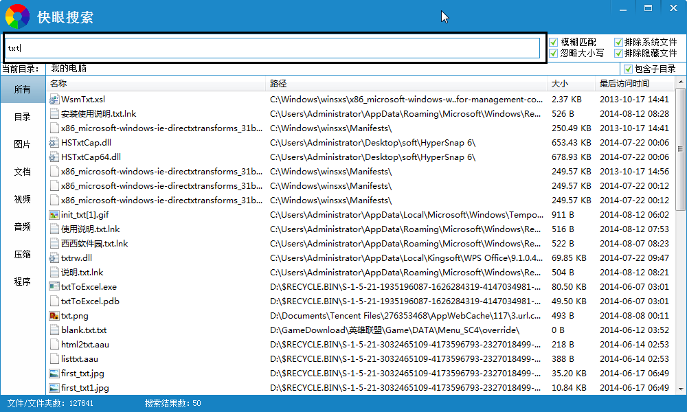 快眼文件搜索是一款可以支持通配符模糊查詢(xún)、多種過(guò)濾方式、多種排序方式,為您帶來(lái)急速的搜索體驗(yàn)的快速文件搜索軟件??煅畚募阉鞑僮骱?jiǎn)單快捷且占用資源少。并且還可以快速搜索電腦中的圖片、文檔、視頻、音頻、壓縮文件、程序等。如此方便的軟件,趕快下載體驗(yàn)吧!??!