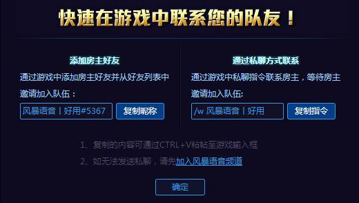 l點擊私聊方式的“復(fù)制指令”按鈕,復(fù)制指令后粘貼(CTRL+V)至游戲聊天輸入框中并回車,即可與房主私聊;